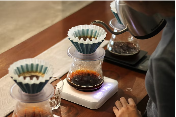 Origami filtre kahve makinesi (185 Kalita dalgalı kağıtlı), Mahlkonig EK43 kahve öğütücü, Bonavita kuğu boyunlu su ısıtıcısı (1L), Acaia Pearl tartı.